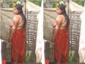 Mature aunty's sensual nude bath in a traditional tub