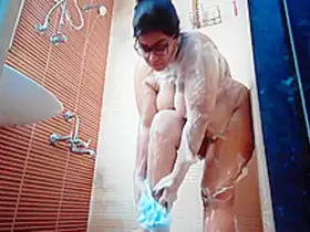 A stunning woman flaunts her breasts and soaps up in the shower